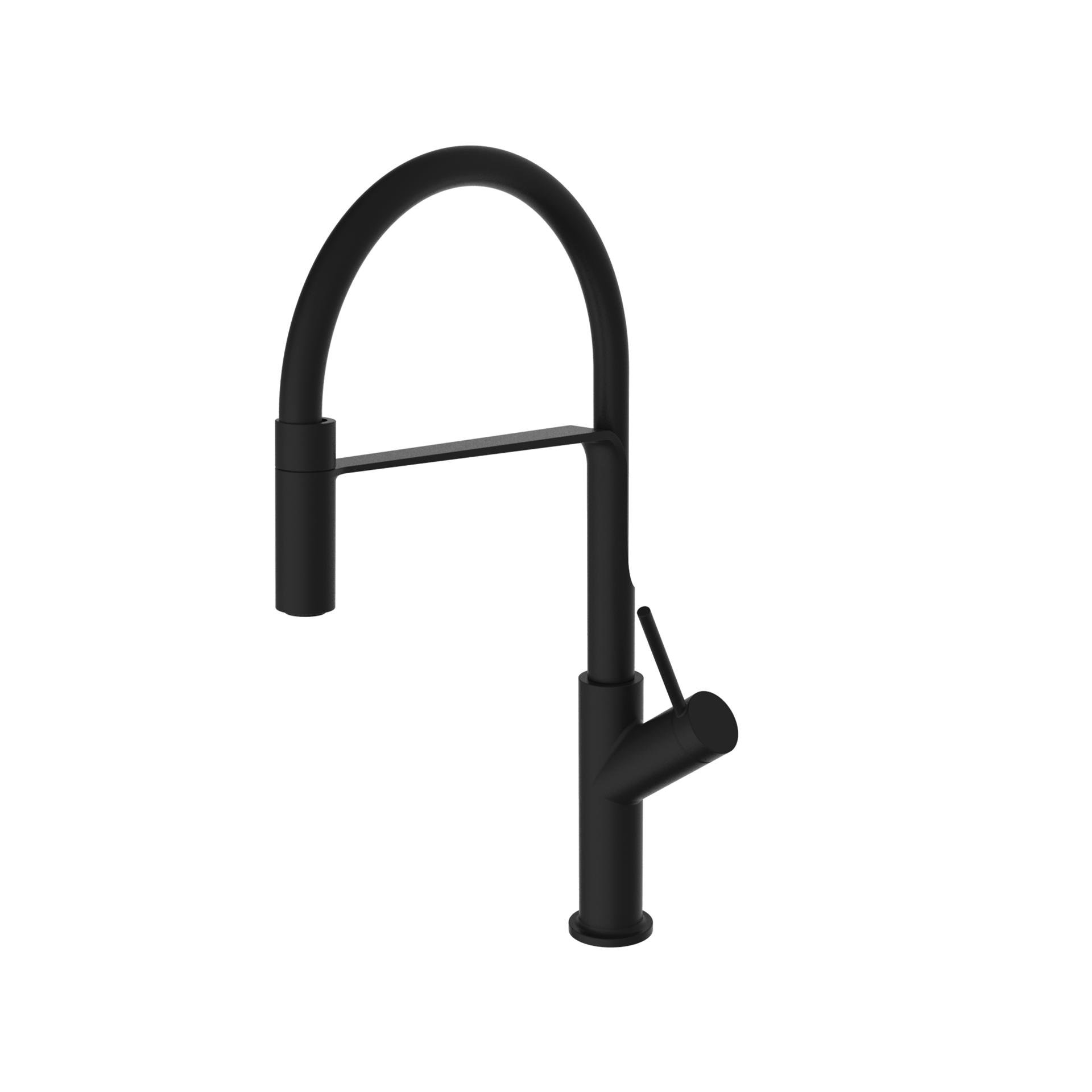 Dřezová stojánková baterie s horním pružným otáčivým ústím s přepínačem, černá matná